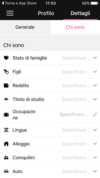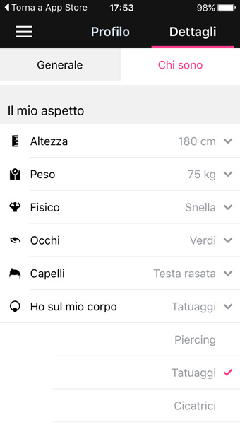 Compilare il tuo profilo richiederà un attimo di tempo, puoi parlare del tuo aspetto fisico e quindi inserire altezza, peso, fisico, occhi, capelli, se hai tatuaggi, il tuo stato di famiglia, se hai figli, titolo di studio, lavoro, lingue conosciute ecc.