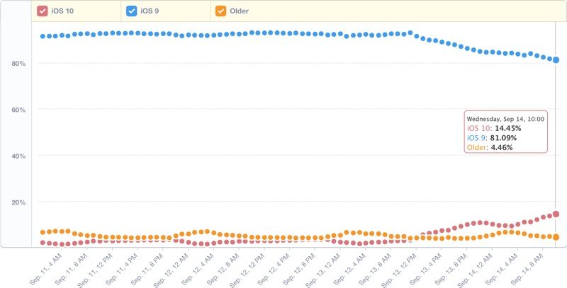 Per fare un confronto, 24 ore dopo il rilascio di iOS 9, il sistema operativo era stato installato sul 12,6%. Il pool preso in esame è sempre lo stesso con i dati raccolti da Mixpanel. Il risultato di iOS 9 è simile a quello da iOS 8 nel 2014 e questo vuol dire che iOS 10 supera sia iOS 8 che iOS 9.