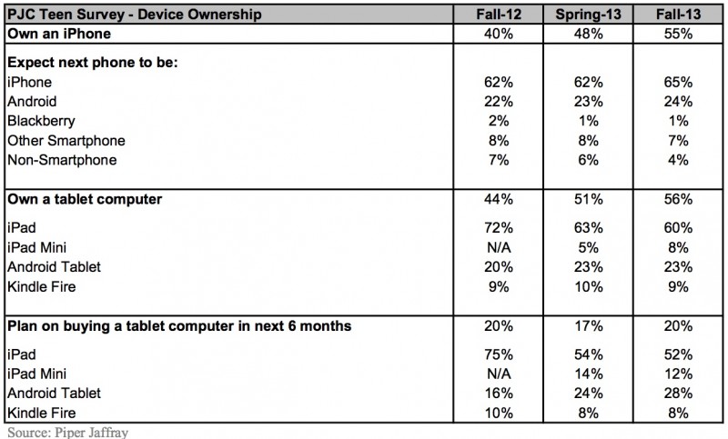 Sia iPhone che iPad continuano a rimanere piuttosto popolari tra i teenagers americani. Questo è emerso da una ricerca condotta dall’analista di Piper Jaffray, Gene Munster. Il 55% dei ragazzi possiede un iPhone, contro il 48% di Aprile e il 40% dell’anno scorso. Apple quindi ha una trend in crescita nel mondo dei giovani americani e questo potrebbe segnare preferenze di consumo anche in futuro.