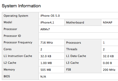 Nell’immagine si possono vedere le specifiche tecniche del nuovo iPhone. Partendo dal processore dual core da 800 Mhz e la RAM da 512 MB come ci si aspettava. Geekbench ha dato un punteggio alla velocità del nuovo iPhone 4S prendendo in analisi la potenza del telefono. In totale iPhone 4S ha segnato 622 punti, che devono venir confrontati con i 749 di iPad 2 e i 370 di iPhone 4. Quindi il nuovo iPhone sembra essere il 68% più veloce di un iPhone 4 ma circa il 17% più lento di un iPad 2.