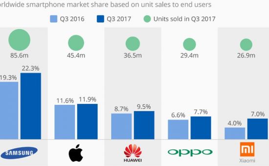 La quota di mercato di Apple è cresciuta dall’11,6% del terzo trimestre 2016 all’11,9% del terzo trimestre 2017. Samsung ha mantenuto stabilmente la sua leadership con il 22,3% di vendite. Questo grazie ad una ampia gamma di smartphone offerti a prezzi differenti.