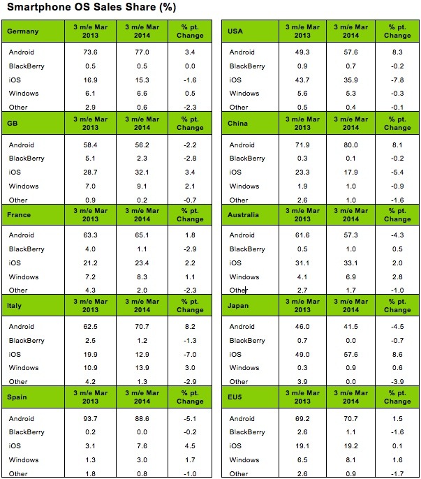 La popolarità di iPhone è cresciuta in Giappone grazie anche all’accordo con il principale operatore telefonico del paese. Windows globalmente cresce e il risultato migliore è in Italia. In Italia è l’unico paese in cui riesce a strappare il secondo posto nel mercato. In Spagna, nonostante il calo del 5%, Android mantiene la leadership con l’88,6%. Negli USA e in Italia, Android è cresciuto più dell’8% anno su anno. Dove invece Windows va peggio è in Cina, con appena l’1% di mercato. Blackberry ormai invece non raggiunge mai più dell’1% se non in Inghilterra con il 2,3%.