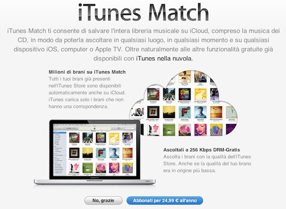 Il servizio tuttavia non è gratuito, ha un costo annuo di 24,99 euro che non è rimborsabile. Da questo momento potete quindi abbonarvi al servizio. L’arrivo di iTunes Match in Italia è conseguenza di un incontro tra Apple e SIAE per un accordo sui diritti d’autore.