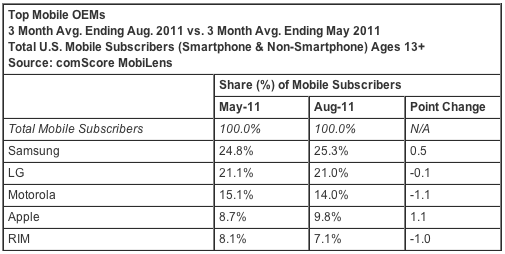 L’ultima indagine condotta da comScore di utilizzo della telefonia mobile negli Stati Uniti, ha rivelato che Apple si sta rapidamente avvicinando ad una quota di mercato pari al 10 % della clientela totale.