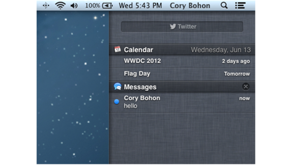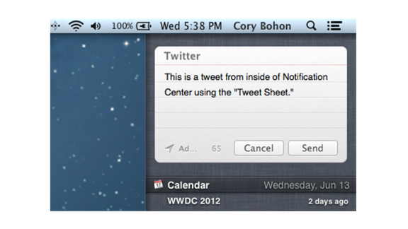 Dal centro notifiche è presente la funzione per mandare messaggi su Twitter direttamente dal Centro Notifiche. Funzione interessante che permette di utilizzare twitter in qualsiasi momento mentre si sta utilizzando il Mac.