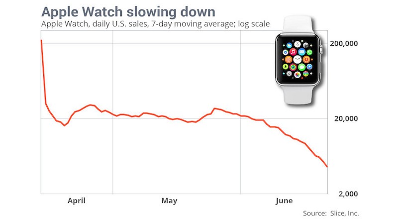 Le vendite di Apple Watch sarebbero calate in modo sensibile nel mese di Giugno secondo una ricerca di Slice Intelligence. Le vendite monitorate riguardano solo quelle del mercato USA. Le vendite sono continuate a calare dopo il lancio del pre-ordine, ma questo è abbastanza naturale per un nuovo prodotto. Il problema sarebbe il mese di Giugno dove il rallentamento è stato piuttosto deciso. Le vendite invece sono rimaste piuttosto stabili durante tutto il mese di Maggio quando Apple ha continuato a distribuire i primi dispositivi e quando, probabilmente, molti utenti hanno preso coraggio per l’acquisto dei dispositivi.