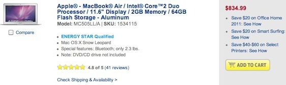 Un esempio è il grosso centro commerciale americano Best Buy che mette in vendita il vecchio MacBook air 11,6 pollici con processore intel Core 2 Duo da 1,4Ghz al prezzo di 835$. Amazon invece lo vende a 879$. Ma il prezzo più basso stranamente è quello di Apple che vende il MacBook Air a 750$. Certo, non è l’ultimo modello ma può comunque essere un’interessante opportunità per avere un MacBook Air nuovo anche se vecchio.