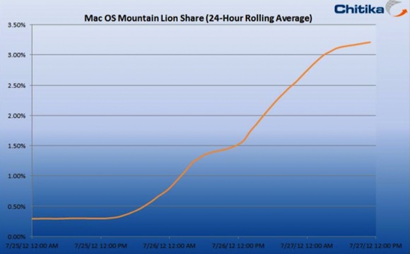 Sono passate 48 ore dal lancio di Mountain Lion e si cominciano a contare i risultati di questo nuovo sistema operativo. Il prezzo di lancio (15euro) ha sicuramente favorito l’affermarsi di questo nuovo sistema operativo, tanto che adesso il 3% dei Mac in circolazione hanno attualmente sistema operativo Mountain Lion.