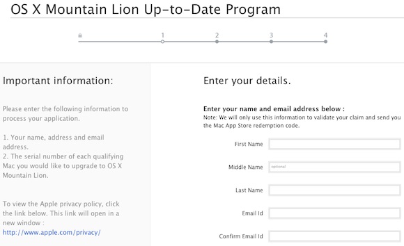 Per poter accedere bisogna ovviamente avere acquistato il Mac dopo l’11 Giugno, vi verranno richiesti data e luogo di acquisto, informazioni personali, e il numero di serie della macchina. Vi terremo aggiornati quando Apple riaprirà la possibilità di richiedere il nuovo Mountain Lion gratuitamente.