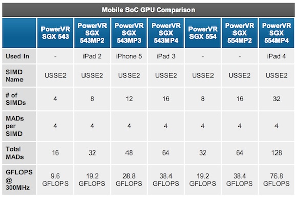 Ma vediamo adesso quello che è successo alla grafica. Il nuovo chip grafico è il PowerVR SGX 554 quad-core. Questo chip è notevolmente migliorato rispetto al Power VR SGX 543MP4 usato in iPad 3 con processore A5X ed è anche migliore del Power VR SGX 543MP3 usato in iPhone 5 con processore A6. Questo nuovo chip è di un livello superiore e probabilmente verrà introdotto in versione triple-core sul prossimo iPhone.