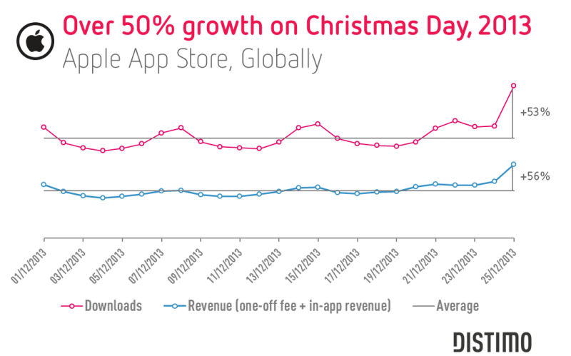 Secondo l’agenzia di ricerca Distimo, l’App Store di Apple avrebbe raggiunto nuovi record nel download delle applicazioni nel periodo di Natale. I guadagni dell’App Store sono cresciuti del 56% e i numeri di download sono aumentati del 53%. I dati riguardano grosse case produttrici come Rovio Entertainment e ZeptoLab, che strategicamente hanno rilasciato nuove app proprio prima di Natale per massimizzare i profitti.