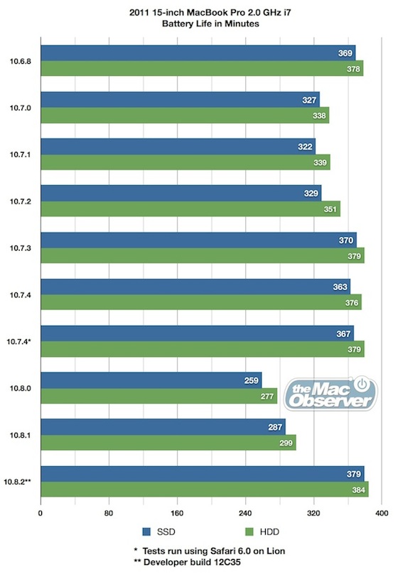 Ars Technica aveva già notato che i nuovi MacBook Pro/Air con dentro il sistema operativo Mountain Lion avevano avuto una riduzione della batteria del 38%. Non è poco perchè significa che se un Mac inizialmente aveva una batteria da 8 ore, con il nuovo sistema operativo dura circa 5 ore. Mac Observer aveva notato lo stesso problema e nella tabella riportata nell’immagine dell’articolo si vede chiaramente questo calo di durata.