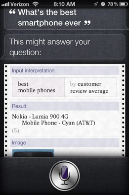 La risposta di Siri è stata secca e tutt’altro che scontata: “il Nokia Lumia 900 di colore ciano”. Magari ci si aspettava un parere di parte con risposta a favore di iPhone 4S che Apple definisce il miglior iPhone di sempre. Ma, evidentemente non è andata così. La motivazione di fondo di questa risposta potrebbe risiedere nei volumi di vendita registrati negli Stati Uniti dal Nokia Lumia 900.