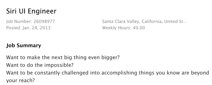 Apple è alla ricerca di nuovi ingegneri per lavorare a Siri. Per il posto in ballo bisogna lavorare all’integrazione di Siri in Mac OS X. Questo confermerebbe le voci che abbiamo scritto questa settimana riguardo il nuovo OS X 10.9 che arriverà questo anno. Il nuovo OS X avrà Siri all’interno come è disponibile per iPhone, iPad, iPod Touch. In questo modo OS X sarà sempre più vicino al sistema iOS.