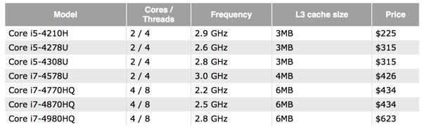 Intel ieri ha lanciato il nuovo processore Haswell disegnato per computer di alto livello. Questo processore potrebbe funzionare sui nuovi MacBook Pro Retina da 13 e 15 pollici. Intel ha rilasciato 3 nuove CPU i5 e 3 nuove CPU i7 che sarebbero i successori diretti dei processori utilizzati negli attuali MacBook Pro Retina. L’incremento di performance è piuttosto modesto, con un aumento di 200 MHz rispetto agli attuali processori Haswell.
