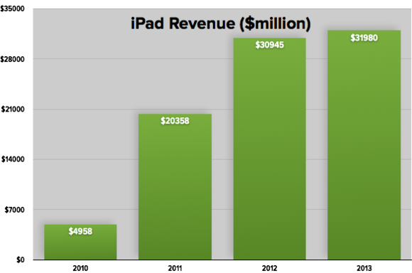 Pare però che questo trend di crescita non sia eterno. Nel 2010 il prezzo medio di un iPad era di 665$ mentre nel 2013 è stato di 450$. Nel terzo trimestre del 2013 le unità vendute sono calate anno su anno da 17 milioni a 14,6 milioni. I guadagni dalle vendite sono calati del 30,5%. Nel quarto e ultimo trimestre del 2013 le vendite sono praticamente piatte.