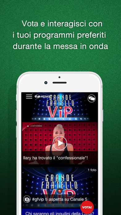 L’app Mediaset serve principalmente ad interagire con i canali televisivi e i programmi, si può ad esempio votare per i reality shows ma si possono anche avere informazioni riguardo il palinsesto, i programmi, le esclusive e le anteprime.