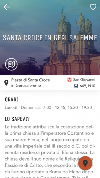 Iniziamo dai luoghi: ogni Chiesa, Cattedrale, Basilica è rappresentata da una scheda molto completa con tanto di orari di apertura, fermata metro più vicina, linee dei tram per raggiungerla, curiosità e persino una piantina della struttura con la descrizione delle zone principali.