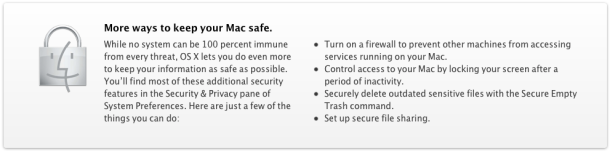 Le scritte riguardo la sicurezza sono cambiate all’interno del sito web dopo che è stato riconosciuto un primo attacco ai computer con sistema operativo Mac OS X. Se prima infatti era scritto su internet che i Mac tengono protetti i file da migliaia di virus per Windows, ora invece si specifica che le caratteristiche interne del software tengono al sicuro dal download di software maligni. Effettivamente qualsiasi cosa scaricata al di fuori del Mac App Store, su siti privati, potrebbe essere a rischio virus e spetta all’utente decidere se correre o no il rischio.