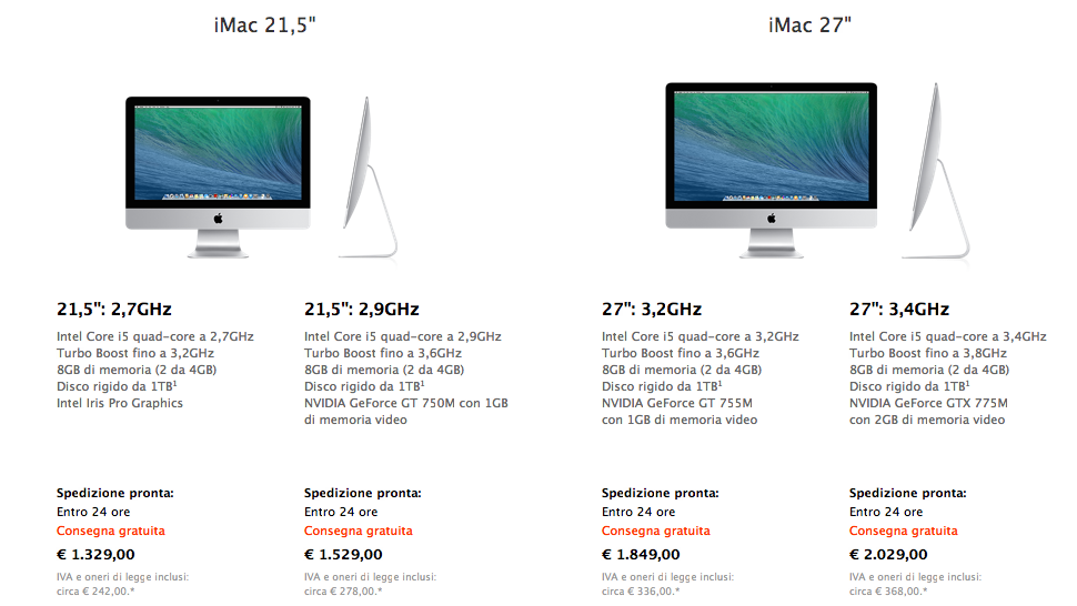 Apple ha già provato ad aggiornare la sua linea di MacBook Air con un piccolo aggiornamento della linea di processori Haswell. I risultati in termini pratici sono piuttosto scarsi, nel senso che i benefici sono pochi. Quello che è stato più utile per gli utenti è lo sconto che è arrivato nel resto del mondo di circa 100$. Apple potrebbe decidere di fare una mossa simile per quello che riguarda iMac. Attualmente i prezzi degli iMac vanno da 1329€ per il modello con schermo da 21,5 pollici e 2,7 Ghz fino a 2029€ per il modello con schermo da 27 pollici e 3,4 Ghz.