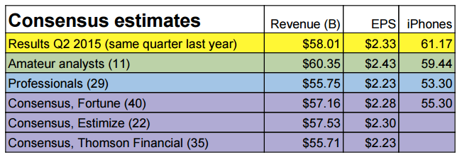 Apple ha già annunciato che Apple Store ha avuto le vendite natalizie più redditizie di sempre. Il fatturato di Apple nel trimestre dovrebbe essere di $55.75 miliardi secondo gli analisti professionali, mentre quelli amatoriali stimano $60.35 miliardi. Entrambe le stime sono intorno ai risultati dello stesso trimestre dello scorso anno che registrava un fatturato di $58.01 miliardi. Entrambi i gruppi di analisti stimano un calo delle vendite di iPhone.