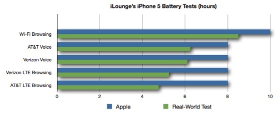 iLounge ha condotto un test sull’effettiva autonomia della batteria con i nuovi iPhone 5. Apple ha dichiarato che la batteria aveva una durata molto buona, 10 ore in navigazione WiFi e 8 ore in navigazione 3G. Secondo i test questi numeri devono essere ridimensionati.
