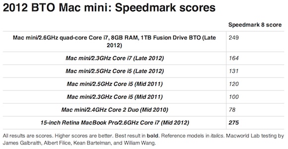 Nell’immagine dell’articolo trovate un confronto con i modelli passati e con il MacBook Pro Retina che invece utilizza solo la tecnologia Flash. Come si può notare il Mac Mini con lo stesso processore riesce quasi a raggiungere la stessa velocità nonostante abbia Fusion Drive e quindi un hard disk oltre che la memoria Flash.