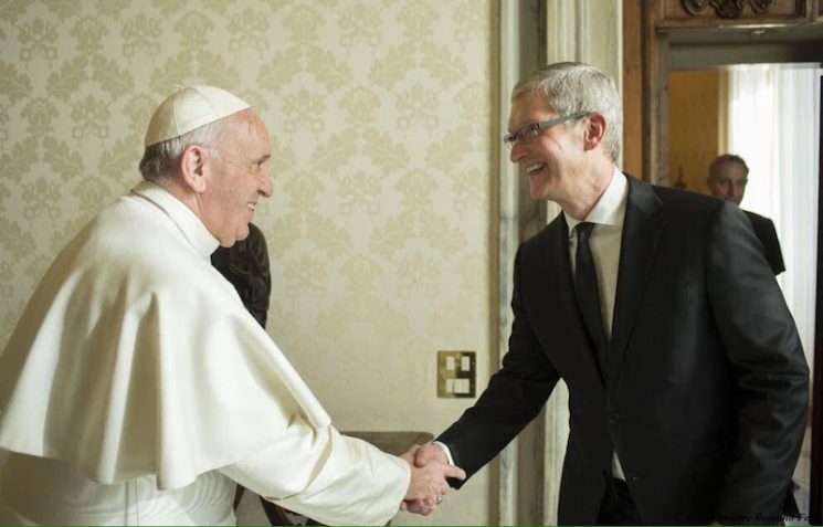 Nel frattempo Tim Cook ha fatto visita anche a Papa Francesco. L’oggetto dell’incontro avvenuto alle 11.30 e con durata 15 minuti, è rimasto privato. Papa Francesco ha dimostrato di essere attivo dal punto di vista tecnologico, e il suo vecchio iPad è stato messo all’asta per 30.500$ l’anno scorso.