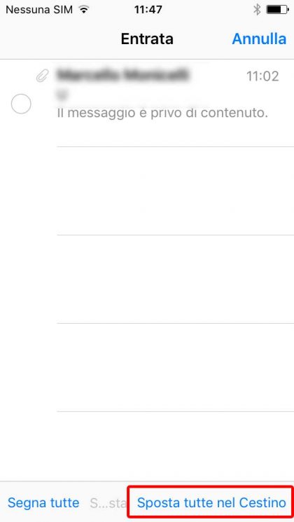 - Ora recati nel cestino, fai tap su “modifica“, “segna tutte” e successivamente “elimina tutte“, ricorda che questa operazione sul tuo iPad o iPhone comporterà l’eliminazione definitiva delle email dal server.