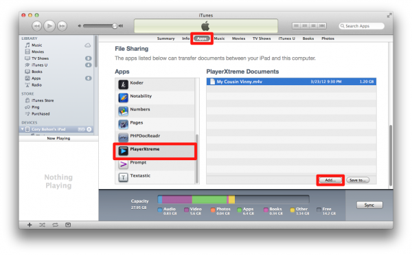 Via cavo bisogna collegare l’iPad con il Mac e lanciare iTunes. Cliccare nella sezione dei dispositivi sull’iPad e selezioniamo subito la tab Apps. Prima scaricate l’App dentro l’iPad e poi nella sezione di Condivisione File dovreste trovare anche l’applicazione PlayerXtreme. A questo punto copiate e incollate i file che vi servono direttamente all’interno del riquadro. Dopo aver finito di aggiungere i file che volevate, potete sincronizzare il dispositivo e il lavoro è fatto.