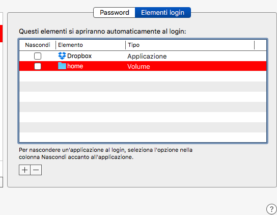 a questo punto seleziona le applicazione che si avviano e clicca sul segno meno nella parte bassa della finestra