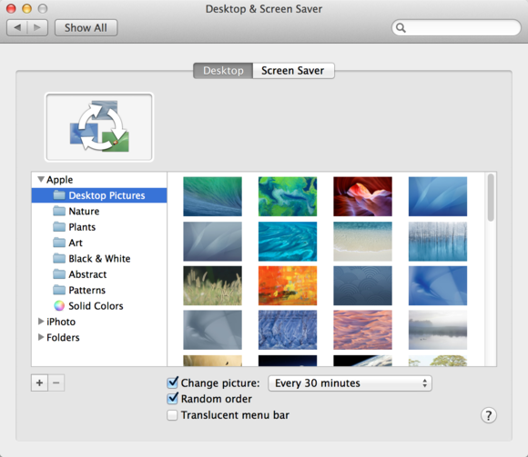 Tutti sanno che lo sfondo del Desktop del Mac si può cambiare, seguendo lo stesso procedimento di prima ma schiacciando sulla tab Desktop invece che Screen Saver. In basso c’è il quadratino da spuntare per cambiare l’immagine di sfondo ad intervalli regolari di tempo. Se inoltre volete avere l’effetto sorpresa, potete spuntare il quadratino sotto per avere un ordine casuale delle immagini.