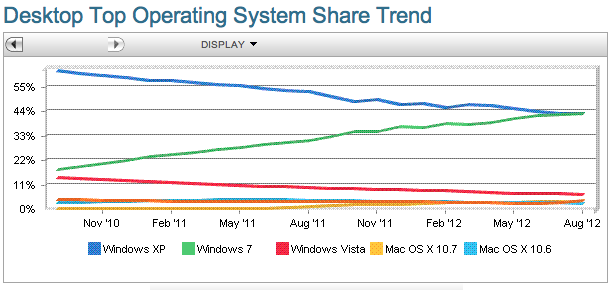 Dopo 3 anni dal lancio, finalmente Windows 7 è riuscito a battere Windows XP che fino ad oggi aveva tenuto la leadership mondiale come sistema operativo più utilizzato al mondo. Nel mercato mondiale Windows 7 ha una diffusione del 42,7%, mentre Windows XP ha il 42,5% dei computer desktop. NetMarketShare ha tenuto d’occhio lo sviluppo mensile dei diversi sistemi operativi, compreso Mac OS X. La diffusione dei Mac a livello di desktop è ancora molto bassa: Mac OS X 10.7 + 10.6 segnano insieme poco più del 5% di mercato.